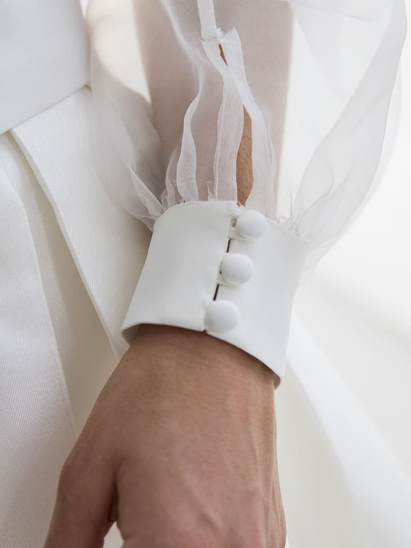 Our Organza Bomber Jacket is the perfect addition to your overall bridal look. The perfect blend of cool and casual, our bomber lends easy, stylish appeal to your evening and post ceremony look. This jacket features long elegant balloon sleeves with a satin cuff and buttons, satin collar and waist band and a metalic opening front zip. The back is embellished with the word “Mrs” and is available in a wide choice of colours.